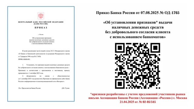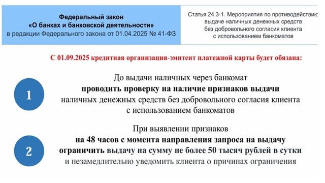 Информация о новых мерах по противодействию банков выдаче наличных денежных средств без добровольного согласия клиентов с использованием банкоматов, которые заработают с 1 сентября 2025 г. в соответствии с Федеральным законом «О банках и банковской деятельности» в редакции Федерального закона от 01.04.2025 № 41-ФЗ.